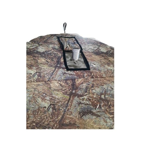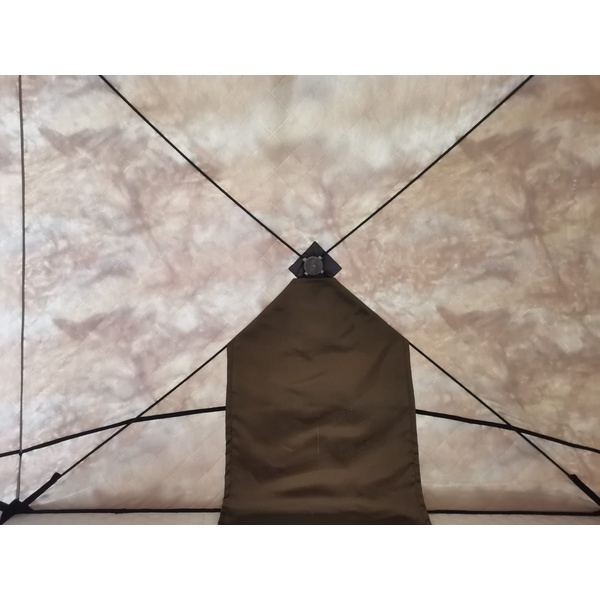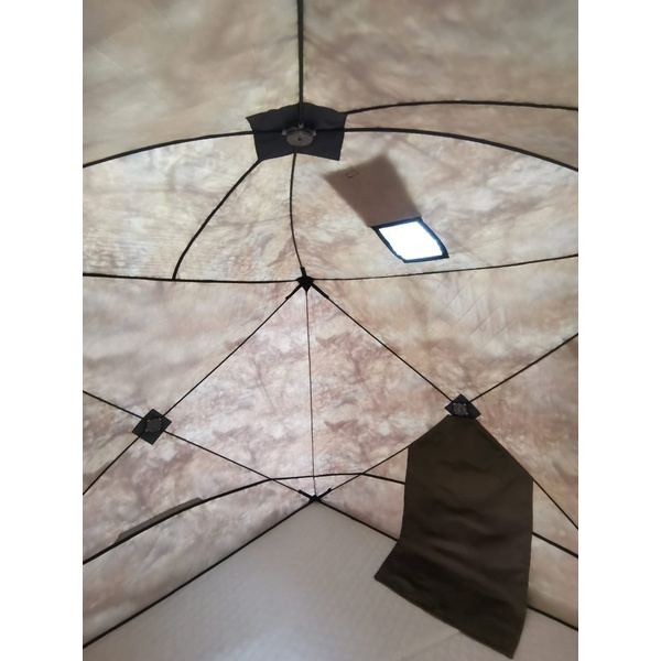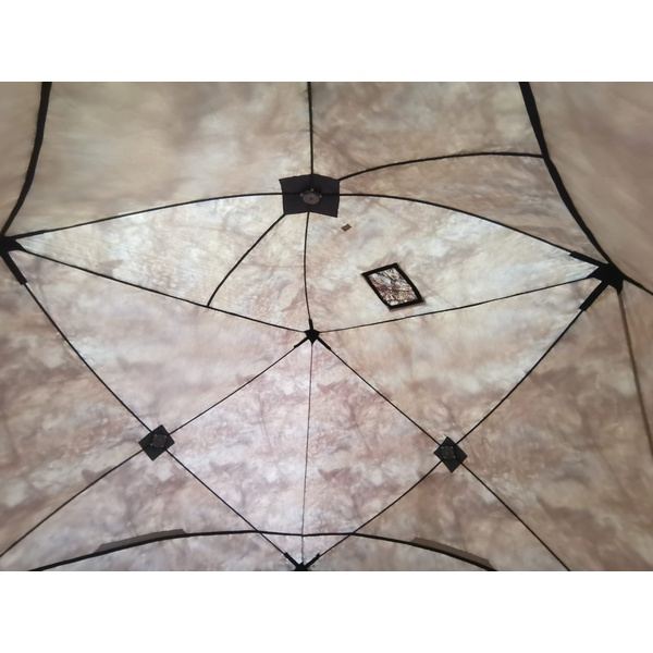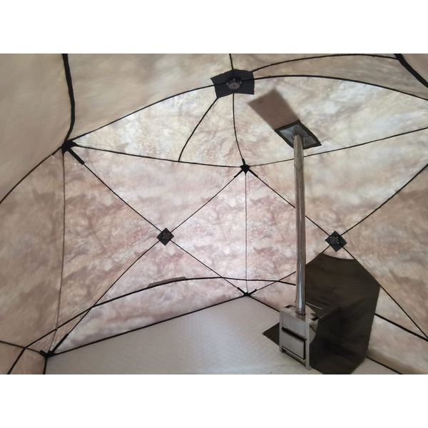В крыше окно на липе с клапаном, для установки выхода трубы печи. В комплект уже входит окно с металлической вставкой, с возможностью установки трубы диаметром от 65 до 120 мм, а так же экран из базальта, который обезопасит стенку палатки от контакта с горячей печью.