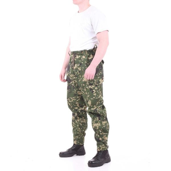 Материал брюк – усиленная ткань «рип-стоп» с камуфляжным рисунком. Это материал, который не мнется, не застирывается, не выгорает на солнце, не шуршит при движении, устойчив к истиранию. Повреждения на этой ткани не имеют склонности к самопроизвольному распространению, даже если полотно находится под нагрузкой