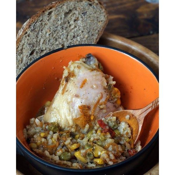 Состав: мясо цыпленка (филе), горошек зеленый, кукуруза сладкая, перец сладкий, лук репчатый, морковь свежая, крупа рисовая, соль поваренная пищевая, чеснок сушеный, перец черный молотый.