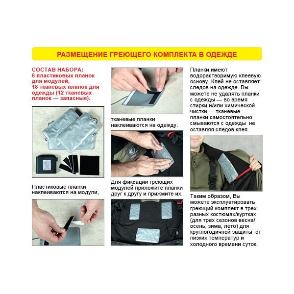 Использование греющего комплекта расширяет температурный диапазон использования одежды при низких температурах и создает комфортный тепловой режим для человека.