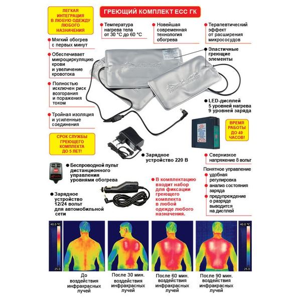 При выходе из помещения наружу, достаточно одного нажатия кнопки, чтобы контраст смены температуры был не столь ощутим. Использование греющего комплекта расширяет температурный диапазон использования одежды при низких температурах и создает комфортный тепловой режим для человека.