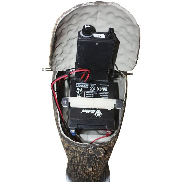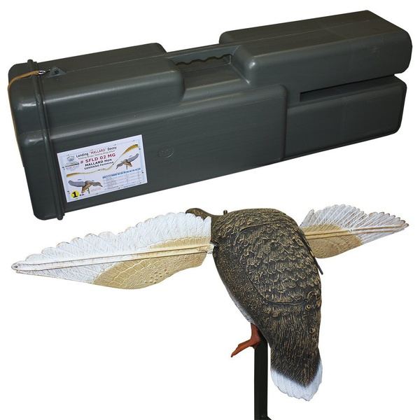 Чучело утки (селезня), машущее крыльями, укомплектовано электромотором, вращающимися крыльями, аккумулятором с зарядным устройством, беспроводным пультом дистанционного включения, регулируемой металлической стойкой ножкой, пластиковым кофром для перевозки и хранения.
