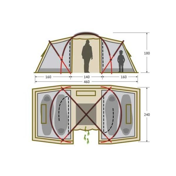 Популярная комфортабельная палатка из серии компакт-кемпинг. Палатка состоит из двух спален (2+2) и тамбура посередине. Высота тамбура 180 см. Конструкция палатки предполагает несколько вариантов использования внутреннего пространства, так как спальни независимо подвешиваются изнутри. Вы можете собрать две спальни или одну, разместив в оставшемся пространстве столовую или склад или оставить только внешний тент и использовать большое внутреннее пространство под кают-компанию.
